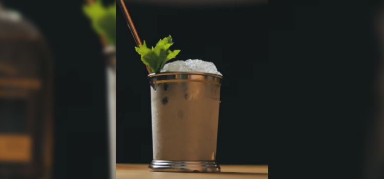 Muddle the sugar cube, syrup and mint leaves in a glass. Add the bourbon and crushed ice, then mix it with a spoon. Top it off with more ice, mint, and straw as a garnish, and let them stir it.